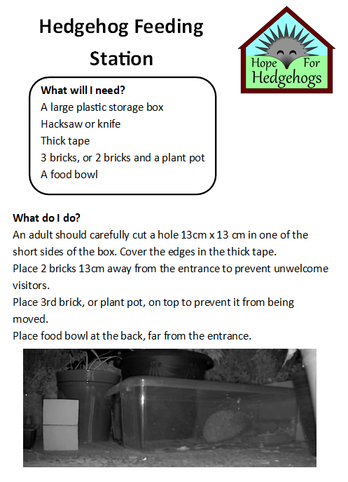 This is our guide to creating a feeding station for our prickly visitors. See beneath for some helpful hints and what to feed them and what to avoid feeding them!